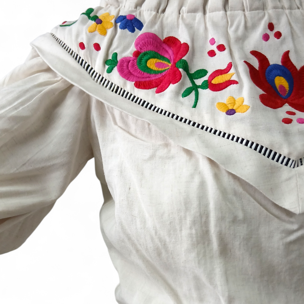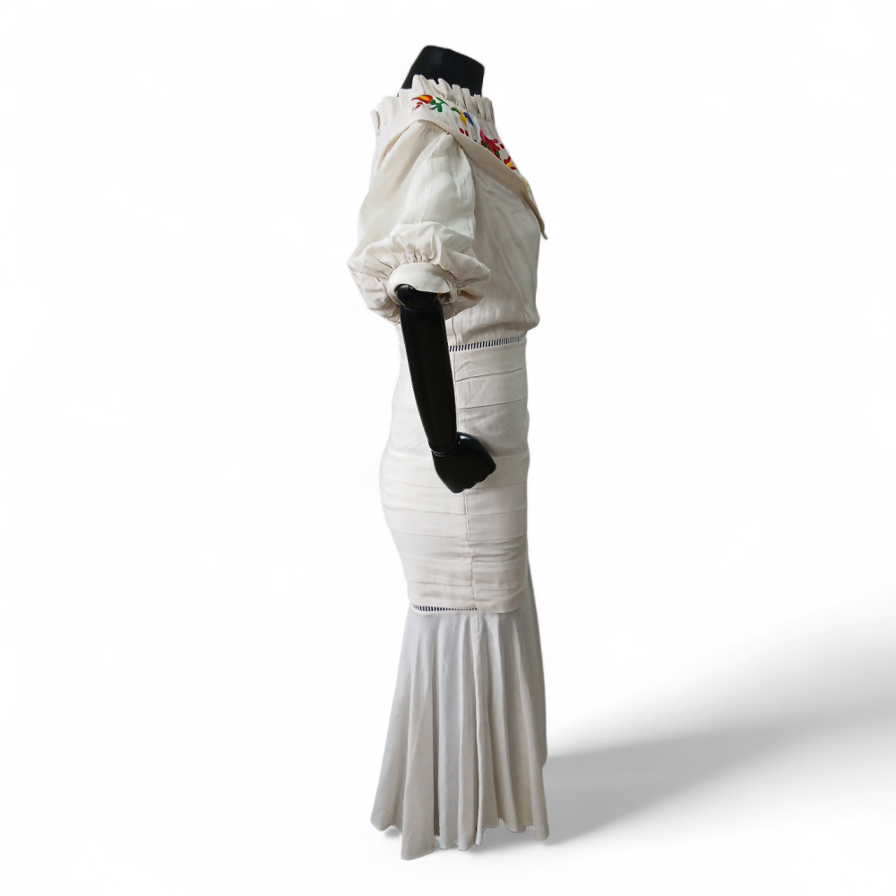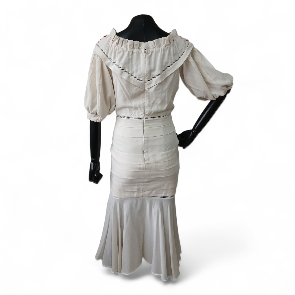 Peça em excelente estado de conservação, possui detalhes vazados na região da cintura e busto, bordados coloridos, fecho por colchete e zíper invísivel posterior. Acompanha etiqueta