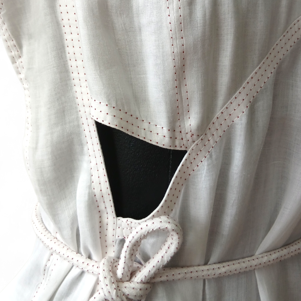 Peça em excelente estado de conservação. Possui cordão para amarração, recorte abaixo do busto, fenda frontal e fecho por botões na região posterior. Acompanha cordão para amarração.