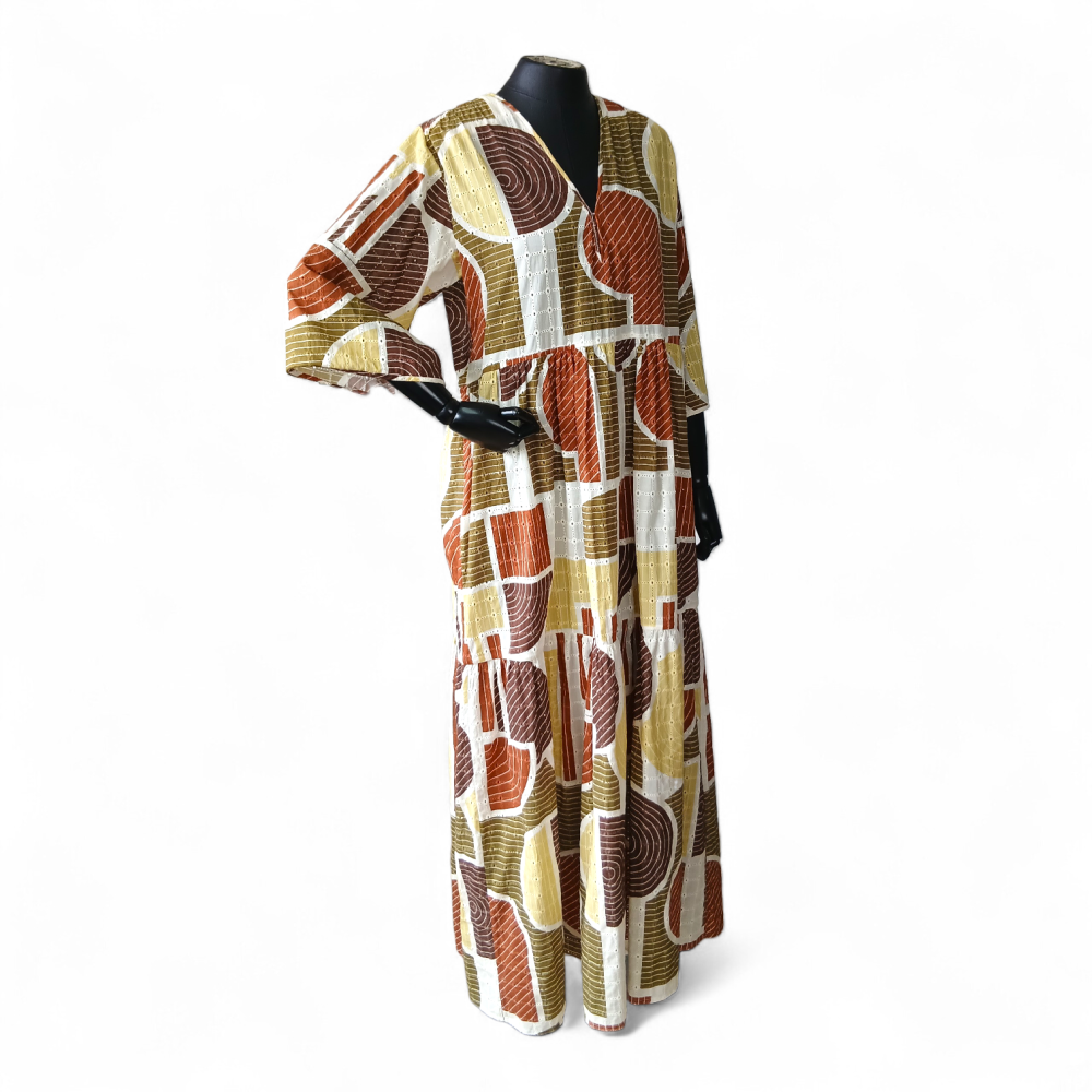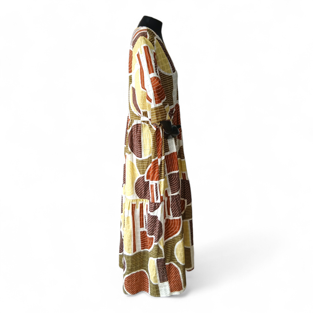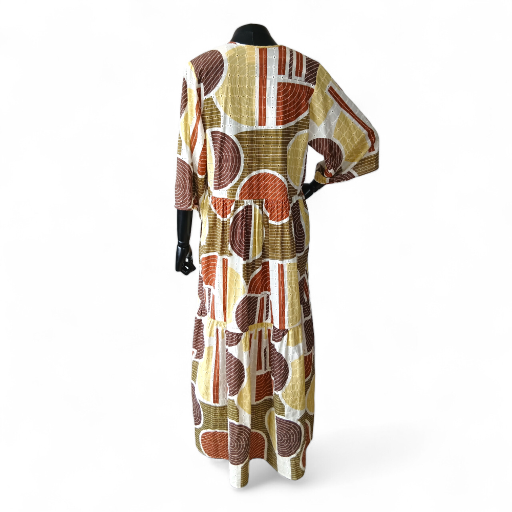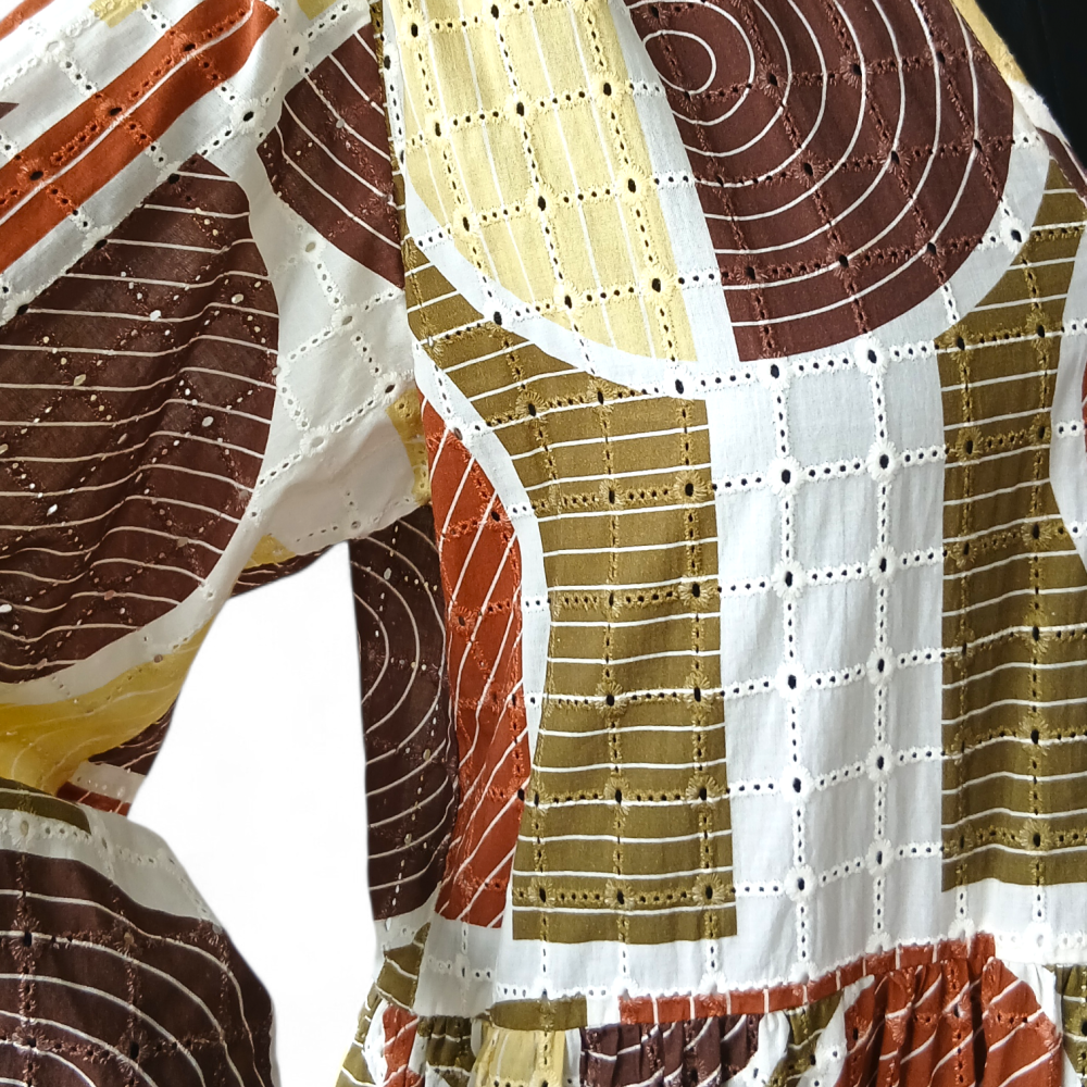 Peça em excelente estado de conservação. Possui ombreiras, estampa em tons de marrom, bege, verde e amarelo, gola V, detalhes pequenos vazados por todo tecido.