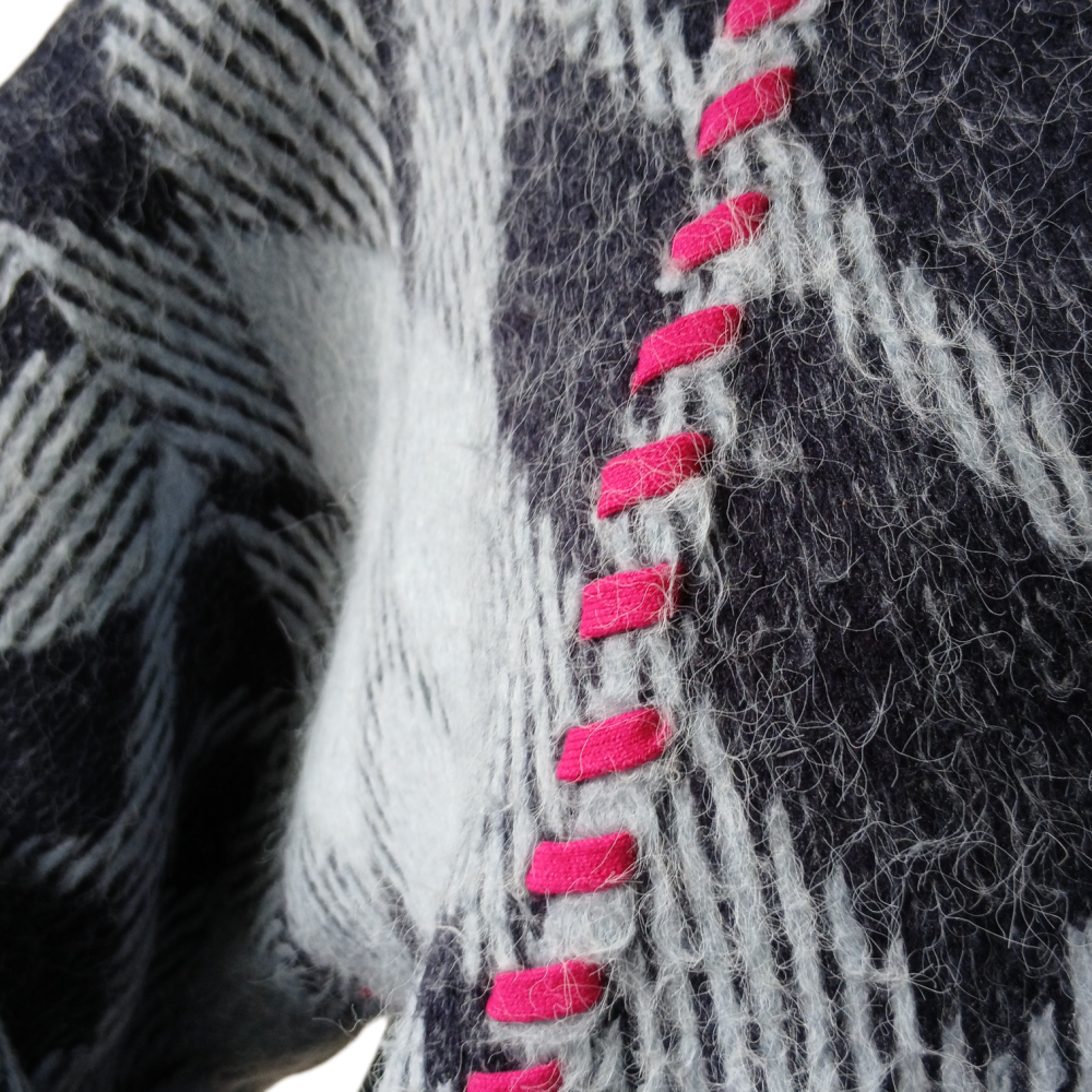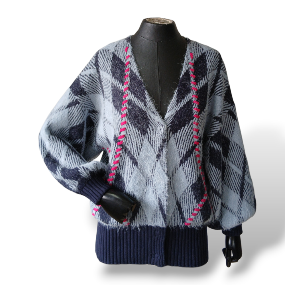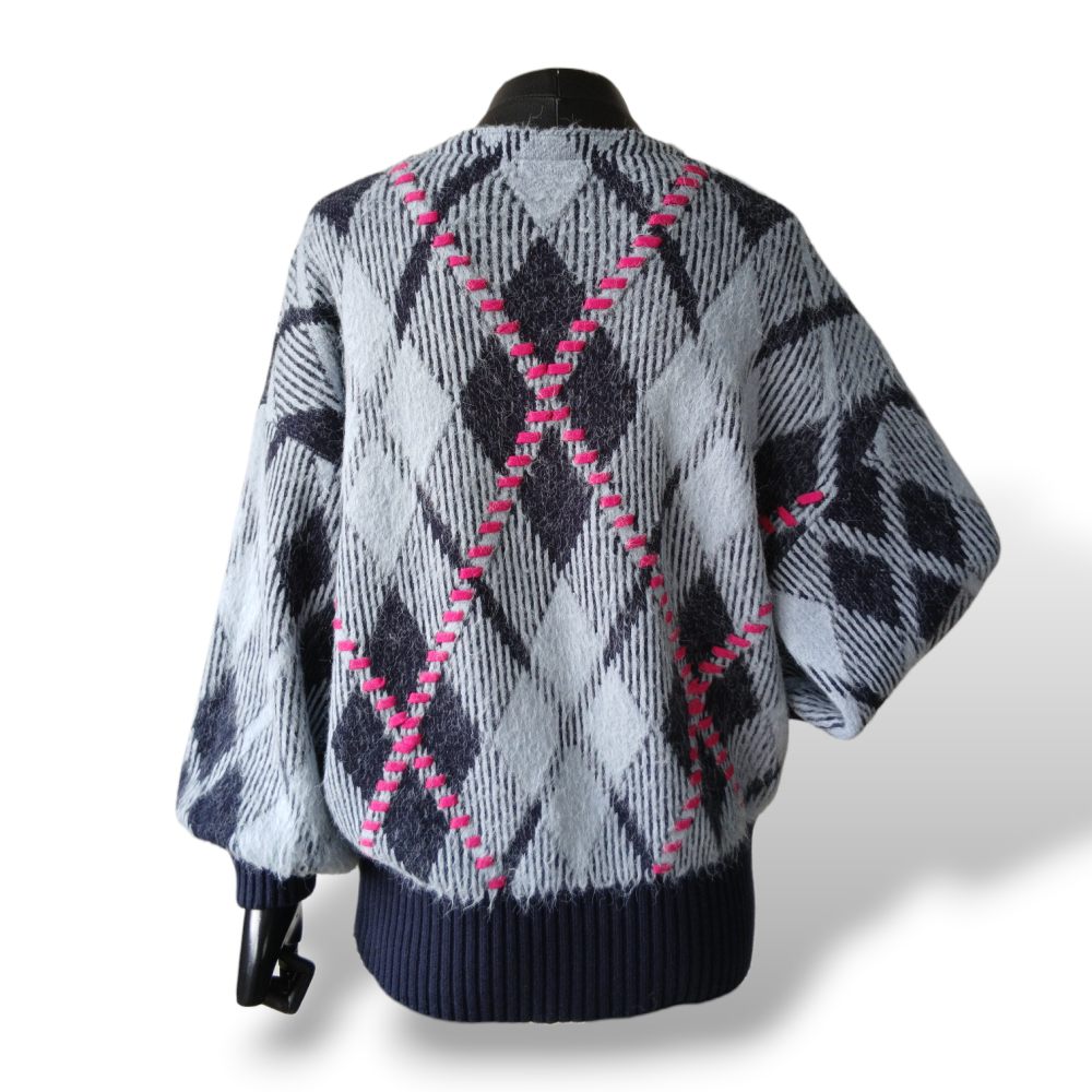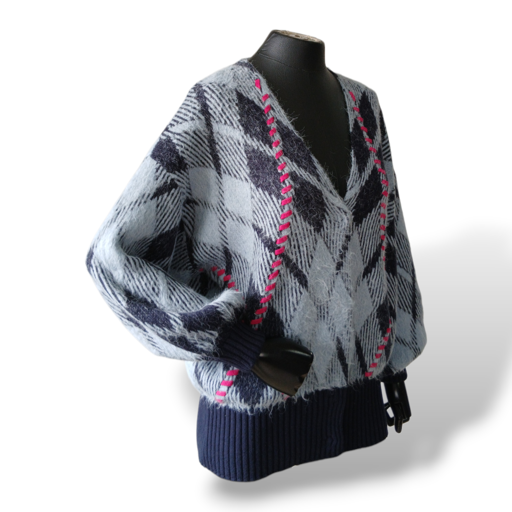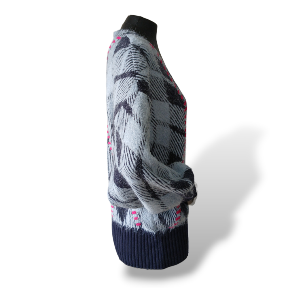Peça em excelente estado de conservação. Possui detalhe de tira na cor rosa, tecido em tons de azul, barra e punhos canelados.